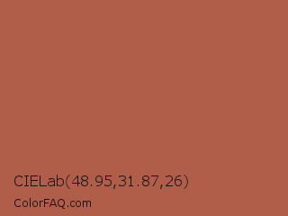 CIELab 48.95,31.87,26 Color is a normal red color and the nearest color is Giants Club #b05c52. Hex code #b05d4a and RGB value is rgb(176,93,74). In RGB color space, this color is composed of 69% red, 36% green, 29% blue, In CMYK color space, this color is composed of 0% cyan, 47% magenta, 58% yellow , 31% black , In HSL color space, this color has a hue angle of 11° , 41% saturation and 49% lightness.