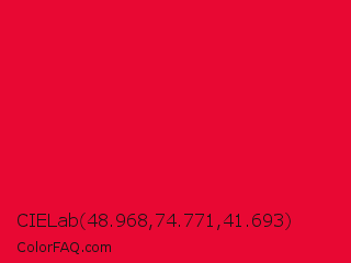 CIELab 48.968,74.771,41.693 Color is a normal red color and the nearest color is Medium Candy Apple Red #e2062c. Hex code #e80833 and RGB value is rgb(232,8,51). In RGB color space, this color is composed of 91% red, 3% green, 20% blue, In CMYK color space, this color is composed of 0% cyan, 97% magenta, 78% yellow , 9% black , In HSL color space, this color has a hue angle of 348° , 93% saturation and 47% lightness.