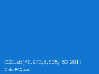 CIELab 48.973,6.835,-53.281 Color is a normal blue color and the nearest color is Bright Navy Blue #1974d2. Hex code #1076cf and RGB value is rgb(16,118,207). In RGB color space, this color is composed of 6% red, 46% green, 81% blue, In CMYK color space, this color is composed of 92% cyan, 43% magenta, 0% yellow , 19% black , In HSL color space, this color has a hue angle of 208° , 86% saturation and 44% lightness.