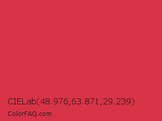 CIELab 48.976,63.871,29.239 Color is a normal red color and the nearest color is Rusty Red #da2c43. Hex code #d93347 and RGB value is rgb(217,51,71). In RGB color space, this color is composed of 85% red, 20% green, 28% blue, In CMYK color space, this color is composed of 0% cyan, 76% magenta, 67% yellow , 15% black , In HSL color space, this color has a hue angle of 353° , 69% saturation and 53% lightness.