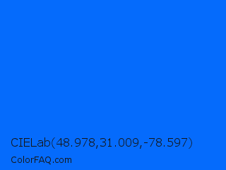 CIELab 48.978,31.009,-78.597 Color is a normal blue color and the nearest color is Blue Ribbon #0066ff. Hex code #056bfc and RGB value is rgb(5,107,252). In RGB color space, this color is composed of 2% red, 42% green, 99% blue, In CMYK color space, this color is composed of 98% cyan, 58% magenta, 0% yellow , 1% black , In HSL color space, this color has a hue angle of 215° , 98% saturation and 50% lightness.