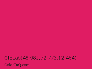 CIELab 48.981,72.773,12.464 Color is a normal rose color and the nearest color is Dogwood Rose #d71868. Hex code #e01c63 and RGB value is rgb(224,28,99). In RGB color space, this color is composed of 88% red, 11% green, 39% blue, In CMYK color space, this color is composed of 0% cyan, 88% magenta, 56% yellow , 12% black , In HSL color space, this color has a hue angle of 338° , 78% saturation and 49% lightness.