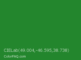 CIELab 49.004,-46.595,38.738 Color is a normal green color and the nearest color is Forest Green #228b22. Hex code #23862d and RGB value is rgb(35,134,45). In RGB color space, this color is composed of 14% red, 53% green, 18% blue, In CMYK color space, this color is composed of 74% cyan, 0% magenta, 66% yellow , 47% black , In HSL color space, this color has a hue angle of 126° , 59% saturation and 33% lightness.