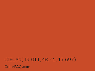 CIELab 49.011,48.41,45.697 Color is a normal red color and the nearest color is Mojo #c04737. Hex code #c94b28 and RGB value is rgb(201,75,40). In RGB color space, this color is composed of 79% red, 29% green, 16% blue, In CMYK color space, this color is composed of 0% cyan, 63% magenta, 80% yellow , 21% black , In HSL color space, this color has a hue angle of 13° , 67% saturation and 47% lightness.