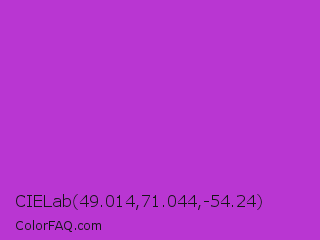 CIELab 49.014,71.044,-54.24 Color is a normal purple color and the nearest color is Steel Pink #cc33cc. Hex code #b936d2 and RGB value is rgb(185,54,210). In RGB color space, this color is composed of 73% red, 21% green, 82% blue, In CMYK color space, this color is composed of 12% cyan, 74% magenta, 0% yellow , 18% black , In HSL color space, this color has a hue angle of 290° , 63% saturation and 52% lightness.