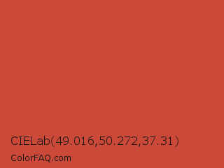 CIELab 49.016,50.272,37.31 Color is a normal red color and the nearest color is Mojo #c04737. Hex code #ca4938 and RGB value is rgb(202,73,56). In RGB color space, this color is composed of 79% red, 29% green, 22% blue, In CMYK color space, this color is composed of 0% cyan, 64% magenta, 72% yellow , 21% black , In HSL color space, this color has a hue angle of 7° , 58% saturation and 51% lightness.