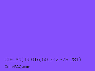 CIELab 49.016,60.342,-78.281 Color is a light indigo color and the nearest color is Navy Purple #9457eb. Hex code #854ffc and RGB value is rgb(133,79,252). In RGB color space, this color is composed of 52% red, 31% green, 99% blue, In CMYK color space, this color is composed of 47% cyan, 69% magenta, 0% yellow , 1% black , In HSL color space, this color has a hue angle of 259° , 97% saturation and 65% lightness.