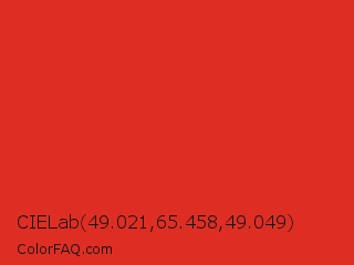 CIELab 49.021,65.458,49.049 Color is a normal red color and the nearest color is Permanent Geranium Lake #e12c2c. Hex code #de2e24 and RGB value is rgb(222,46,36). In RGB color space, this color is composed of 87% red, 18% green, 14% blue, In CMYK color space, this color is composed of 0% cyan, 79% magenta, 84% yellow , 13% black , In HSL color space, this color has a hue angle of 3° , 74% saturation and 51% lightness.