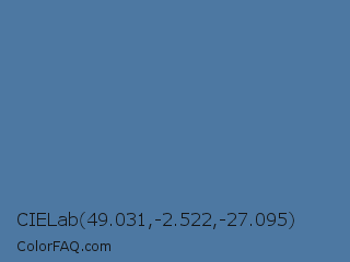 CIELab 49.031,-2.522,-27.095 Color is a normal blue color and the nearest color is Wedgewood #4e7f9e. Hex code #4d78a2 and RGB value is rgb(77,120,162). In RGB color space, this color is composed of 30% red, 47% green, 64% blue, In CMYK color space, this color is composed of 52% cyan, 26% magenta, 0% yellow , 36% black , In HSL color space, this color has a hue angle of 210° , 36% saturation and 47% lightness.