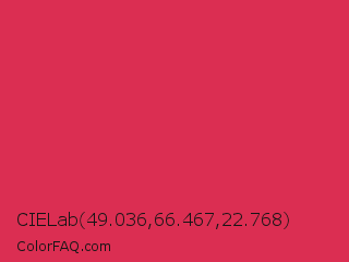 CIELab 49.036,66.467,22.768 Color is a normal red color and the nearest color is Amaranth #e52b50. Hex code #db2e52 and RGB value is rgb(219,46,82). In RGB color space, this color is composed of 86% red, 18% green, 32% blue, In CMYK color space, this color is composed of 0% cyan, 79% magenta, 63% yellow , 14% black , In HSL color space, this color has a hue angle of 348° , 71% saturation and 52% lightness.