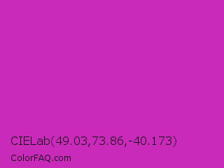 CIELab 49.03,73.86,-40.173 Color is a normal magenta color and the nearest color is Steel Pink #cc33cc. Hex code #c92aba and RGB value is rgb(201,42,186). In RGB color space, this color is composed of 79% red, 16% green, 73% blue, In CMYK color space, this color is composed of 0% cyan, 79% magenta, 7% yellow , 21% black , In HSL color space, this color has a hue angle of 306° , 65% saturation and 48% lightness.