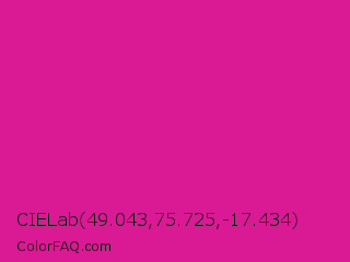CIELab 49.043,75.725,-17.434 Color is a normal magenta color and the nearest color is Barbie Pink #e0218a. Hex code #d91a94 and RGB value is rgb(217,26,148). In RGB color space, this color is composed of 85% red, 10% green, 58% blue, In CMYK color space, this color is composed of 0% cyan, 88% magenta, 32% yellow , 15% black , In HSL color space, this color has a hue angle of 322° , 79% saturation and 48% lightness.