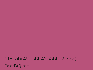 CIELab 49.044,45.444,-2.352 Color is a normal rose color and the nearest color is Tapestry #b05e81. Hex code #b8527a and RGB value is rgb(184,82,122). In RGB color space, this color is composed of 72% red, 32% green, 48% blue, In CMYK color space, this color is composed of 0% cyan, 55% magenta, 34% yellow , 28% black , In HSL color space, this color has a hue angle of 336° , 42% saturation and 52% lightness.