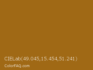 CIELab 49.045,15.454,51.241 Color is a normal orange color and the nearest color is Golden Brown #996515. Hex code #a06915 and RGB value is rgb(160,105,21). In RGB color space, this color is composed of 63% red, 41% green, 8% blue, In CMYK color space, this color is composed of 0% cyan, 34% magenta, 87% yellow , 37% black , In HSL color space, this color has a hue angle of 36° , 77% saturation and 35% lightness.