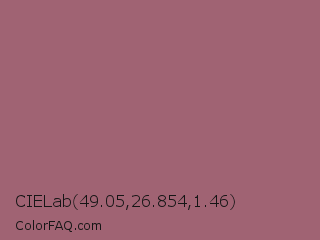 CIELab 49.05,26.854,1.46 Color is a normal rose color and the nearest color is Rose Dust #9e5e6f. Hex code #a06373 and RGB value is rgb(160,99,115). In RGB color space, this color is composed of 63% red, 39% green, 45% blue, In CMYK color space, this color is composed of 0% cyan, 38% magenta, 28% yellow , 37% black , In HSL color space, this color has a hue angle of 344° , 24% saturation and 51% lightness.