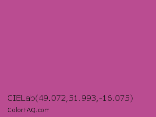 CIELab 49.072,51.993,-16.075 Color is a normal magenta color and the nearest color is Mulberry #c54b8c. Hex code #ba4c91 and RGB value is rgb(186,76,145). In RGB color space, this color is composed of 73% red, 30% green, 57% blue, In CMYK color space, this color is composed of 0% cyan, 59% magenta, 22% yellow , 27% black , In HSL color space, this color has a hue angle of 322° , 44% saturation and 51% lightness.