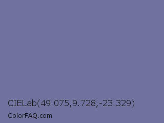 CIELab 49.075,9.728,-23.329 Color is a normal blue color and the nearest color is Kimberly #736c9f. Hex code #70719c and RGB value is rgb(112,113,156). In RGB color space, this color is composed of 44% red, 44% green, 61% blue, In CMYK color space, this color is composed of 28% cyan, 28% magenta, 0% yellow , 39% black , In HSL color space, this color has a hue angle of 239° , 18% saturation and 53% lightness.