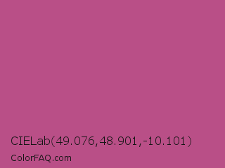 CIELab 49.076,48.901,-10.101 Color is a normal rose color and the nearest color is Mulberry #c54b8c. Hex code #b94f87 and RGB value is rgb(185,79,135). In RGB color space, this color is composed of 73% red, 31% green, 53% blue, In CMYK color space, this color is composed of 0% cyan, 57% magenta, 27% yellow , 27% black , In HSL color space, this color has a hue angle of 328° , 43% saturation and 52% lightness.