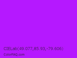 CIELab 49.077,85.93,-79.606 Color is a normal purple color and the nearest color is Electric Purple #bf00ff. Hex code #b517ff and RGB value is rgb(181,23,255). In RGB color space, this color is composed of 71% red, 9% green, 100% blue, In CMYK color space, this color is composed of 29% cyan, 91% magenta, 0% yellow , 0% black , In HSL color space, this color has a hue angle of 281° , 100% saturation and 55% lightness.