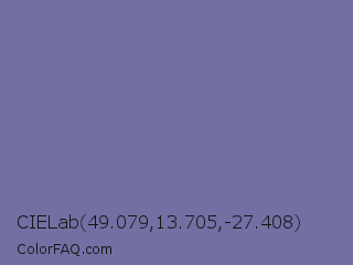 CIELab 49.079,13.705,-27.408 Color is a normal indigo color and the nearest color is Kimberly #736c9f. Hex code #736fa3 and RGB value is rgb(115,111,163). In RGB color space, this color is composed of 45% red, 44% green, 64% blue, In CMYK color space, this color is composed of 29% cyan, 32% magenta, 0% yellow , 36% black , In HSL color space, this color has a hue angle of 245° , 22% saturation and 54% lightness.