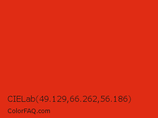 CIELab 49.129,66.262,56.186 Color is a normal red color and the nearest color is Vermilion #d9381e. Hex code #e02c14 and RGB value is rgb(224,44,20). In RGB color space, this color is composed of 88% red, 17% green, 8% blue, In CMYK color space, this color is composed of 0% cyan, 80% magenta, 91% yellow , 12% black , In HSL color space, this color has a hue angle of 7° , 84% saturation and 48% lightness.
