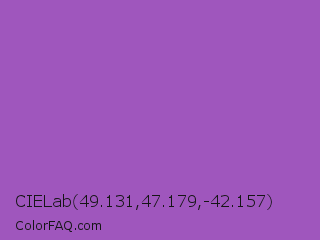 CIELab 49.131,47.179,-42.157 Color is a normal purple color and the nearest color is Deep Lilac #9955bb. Hex code #9f56bd and RGB value is rgb(159,86,189). In RGB color space, this color is composed of 62% red, 34% green, 74% blue, In CMYK color space, this color is composed of 16% cyan, 54% magenta, 0% yellow , 26% black , In HSL color space, this color has a hue angle of 283° , 44% saturation and 54% lightness.