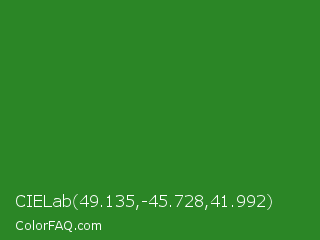 CIELab 49.135,-45.728,41.992 Color is a normal green color and the nearest color is Forest Green #228b22. Hex code #2b8626 and RGB value is rgb(43,134,38). In RGB color space, this color is composed of 17% red, 53% green, 15% blue, In CMYK color space, this color is composed of 68% cyan, 0% magenta, 72% yellow , 47% black , In HSL color space, this color has a hue angle of 117° , 56% saturation and 34% lightness.