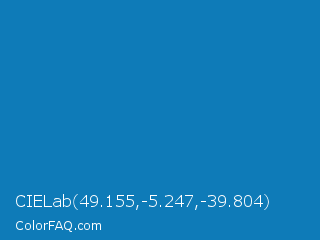 CIELab 49.155,-5.247,-39.804 Color is a normal blue color and the nearest color is Star Command Blue #007bb8. Hex code #0e7bb8 and RGB value is rgb(14,123,184). In RGB color space, this color is composed of 5% red, 48% green, 72% blue, In CMYK color space, this color is composed of 92% cyan, 33% magenta, 0% yellow , 28% black , In HSL color space, this color has a hue angle of 202° , 86% saturation and 39% lightness.