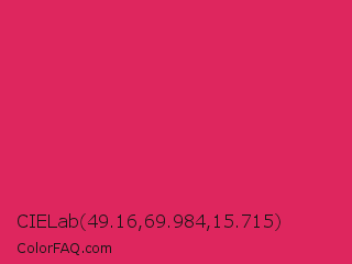 CIELab 49.16,69.984,15.715 Color is a normal rose color and the nearest color is Cerise Red #de3163. Hex code #de265e and RGB value is rgb(222,38,94). In RGB color space, this color is composed of 87% red, 15% green, 37% blue, In CMYK color space, this color is composed of 0% cyan, 83% magenta, 58% yellow , 13% black , In HSL color space, this color has a hue angle of 342° , 74% saturation and 51% lightness.