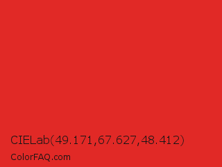 CIELab 49.171,67.627,48.412 Color is a normal red color and the nearest color is Permanent Geranium Lake #e12c2c. Hex code #e12926 and RGB value is rgb(225,41,38). In RGB color space, this color is composed of 88% red, 16% green, 15% blue, In CMYK color space, this color is composed of 0% cyan, 82% magenta, 83% yellow , 12% black , In HSL color space, this color has a hue angle of 1° , 76% saturation and 52% lightness.