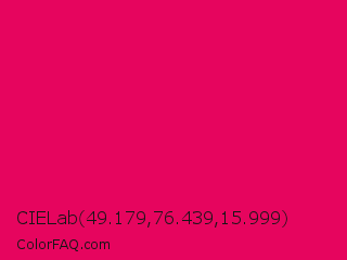 CIELab 49.179,76.439,15.999 Color is a normal rose color and the nearest color is Raspberry #e30b5d. Hex code #e6055e and RGB value is rgb(230,5,94). In RGB color space, this color is composed of 90% red, 2% green, 37% blue, In CMYK color space, this color is composed of 0% cyan, 98% magenta, 59% yellow , 10% black , In HSL color space, this color has a hue angle of 336° , 96% saturation and 46% lightness.