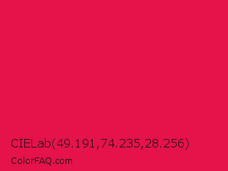 CIELab 49.191,74.235,28.256 Color is a normal rose color and the nearest color is Spanish Crimson #e51a4c. Hex code #e6124a and RGB value is rgb(230,18,74). In RGB color space, this color is composed of 90% red, 7% green, 29% blue, In CMYK color space, this color is composed of 0% cyan, 92% magenta, 68% yellow , 10% black , In HSL color space, this color has a hue angle of 344° , 85% saturation and 49% lightness.