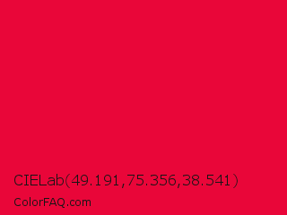 CIELab 49.191,75.356,38.541 Color is a normal red color and the nearest color is Red Ribbon #ed0a3f. Hex code #e90639 and RGB value is rgb(233,6,57). In RGB color space, this color is composed of 91% red, 2% green, 22% blue, In CMYK color space, this color is composed of 0% cyan, 97% magenta, 76% yellow , 9% black , In HSL color space, this color has a hue angle of 347° , 95% saturation and 47% lightness.
