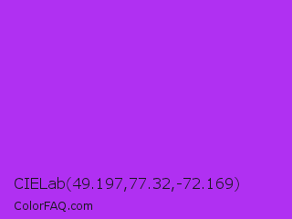 CIELab 49.197,77.32,-72.169 Color is a normal purple color and the nearest color is Veronica #a020f0. Hex code #b030f2 and RGB value is rgb(176,48,242). In RGB color space, this color is composed of 69% red, 19% green, 95% blue, In CMYK color space, this color is composed of 27% cyan, 80% magenta, 0% yellow , 5% black , In HSL color space, this color has a hue angle of 280° , 88% saturation and 57% lightness.