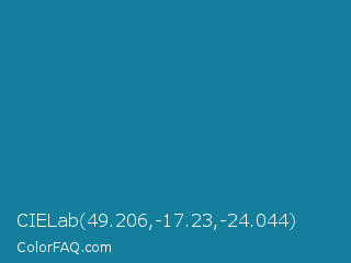 CIELab 49.206,-17.23,-24.044 Color is a normal cyan color and the nearest color is Blue Chill #0c8990. Hex code #147f9d and RGB value is rgb(20,127,157). In RGB color space, this color is composed of 8% red, 50% green, 62% blue, In CMYK color space, this color is composed of 87% cyan, 19% magenta, 0% yellow , 38% black , In HSL color space, this color has a hue angle of 193° , 77% saturation and 35% lightness.
