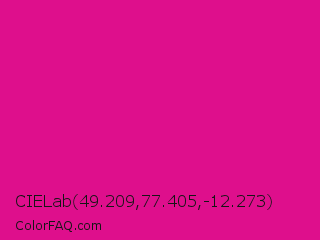 CIELab 49.209,77.405,-12.273 Color is a normal magenta color and the nearest color is Barbie Pink #e0218a. Hex code #de0f8c and RGB value is rgb(222,15,140). In RGB color space, this color is composed of 87% red, 6% green, 55% blue, In CMYK color space, this color is composed of 0% cyan, 93% magenta, 37% yellow , 13% black , In HSL color space, this color has a hue angle of 324° , 87% saturation and 46% lightness.