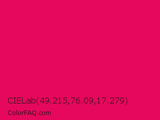 CIELab 49.215,76.09,17.279 Color is a normal rose color and the nearest color is Razzmatazz Crayola #e30b5c. Hex code #e6085c and RGB value is rgb(230,8,92). In RGB color space, this color is composed of 90% red, 3% green, 36% blue, In CMYK color space, this color is composed of 0% cyan, 97% magenta, 60% yellow , 10% black , In HSL color space, this color has a hue angle of 337° , 93% saturation and 47% lightness.