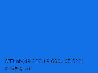 CIELab 49.222,19.886,-67.022 Color is a normal blue color and the nearest color is Bright Navy Blue #1974d2. Hex code #1371e8 and RGB value is rgb(19,113,232). In RGB color space, this color is composed of 7% red, 44% green, 91% blue, In CMYK color space, this color is composed of 92% cyan, 51% magenta, 0% yellow , 9% black , In HSL color space, this color has a hue angle of 214° , 85% saturation and 49% lightness.