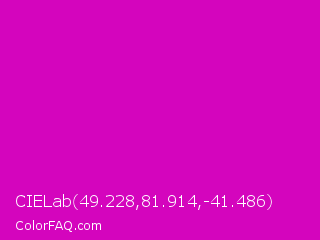 CIELab 49.228,81.914,-41.486 Color is a normal magenta color and the nearest color is Deep Magenta #cc00cc. Hex code #d405bd and RGB value is rgb(212,5,189). In RGB color space, this color is composed of 83% red, 2% green, 74% blue, In CMYK color space, this color is composed of 0% cyan, 98% magenta, 11% yellow , 17% black , In HSL color space, this color has a hue angle of 307° , 95% saturation and 43% lightness.