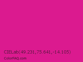 CIELab 49.231,75.641,-14.105 Color is a normal magenta color and the nearest color is Barbie Pink #e0218a. Hex code #db1a8f and RGB value is rgb(219,26,143). In RGB color space, this color is composed of 86% red, 10% green, 56% blue, In CMYK color space, this color is composed of 0% cyan, 88% magenta, 35% yellow , 14% black , In HSL color space, this color has a hue angle of 324° , 79% saturation and 48% lightness.