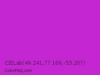 CIELab 49.241,77.169,-53.207 Color is a normal magenta color and the nearest color is Steel Pink #cc33cc. Hex code #c427d1 and RGB value is rgb(196,39,209). In RGB color space, this color is composed of 77% red, 15% green, 82% blue, In CMYK color space, this color is composed of 6% cyan, 81% magenta, 0% yellow , 18% black , In HSL color space, this color has a hue angle of 295° , 69% saturation and 49% lightness.