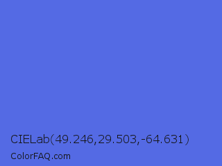 CIELab 49.246,29.503,-64.631 Color is a light blue color and the nearest color is Royal Blue #4169e1. Hex code #546ae4 and RGB value is rgb(84,106,228). In RGB color space, this color is composed of 33% red, 42% green, 89% blue, In CMYK color space, this color is composed of 63% cyan, 54% magenta, 0% yellow , 11% black , In HSL color space, this color has a hue angle of 231° , 73% saturation and 61% lightness.