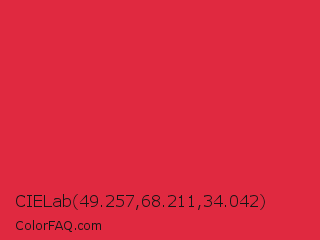 CIELab 49.257,68.211,34.042 Color is a normal red color and the nearest color is Rusty Red #da2c43. Hex code #e02940 and RGB value is rgb(224,41,64). In RGB color space, this color is composed of 88% red, 16% green, 25% blue, In CMYK color space, this color is composed of 0% cyan, 82% magenta, 71% yellow , 12% black , In HSL color space, this color has a hue angle of 352° , 75% saturation and 52% lightness.