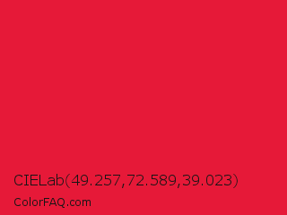 CIELab 49.257,72.589,39.023 Color is a normal red color and the nearest color is Crimson #dc143c. Hex code #e61938 and RGB value is rgb(230,25,56). In RGB color space, this color is composed of 90% red, 10% green, 22% blue, In CMYK color space, this color is composed of 0% cyan, 89% magenta, 76% yellow , 10% black , In HSL color space, this color has a hue angle of 351° , 80% saturation and 50% lightness.