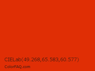 CIELab 49.268,65.583,60.577 Color is a normal red color and the nearest color is Grenadier #d54600. Hex code #e02e05 and RGB value is rgb(224,46,5). In RGB color space, this color is composed of 88% red, 18% green, 2% blue, In CMYK color space, this color is composed of 0% cyan, 79% magenta, 98% yellow , 12% black , In HSL color space, this color has a hue angle of 11° , 96% saturation and 45% lightness.