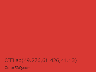 CIELab 49.276,61.426,41.13 Color is a normal red color and the nearest color is CG Red #e03c31. Hex code #d93833 and RGB value is rgb(217,56,51). In RGB color space, this color is composed of 85% red, 22% green, 20% blue, In CMYK color space, this color is composed of 0% cyan, 74% magenta, 76% yellow , 15% black , In HSL color space, this color has a hue angle of 2° , 69% saturation and 53% lightness.