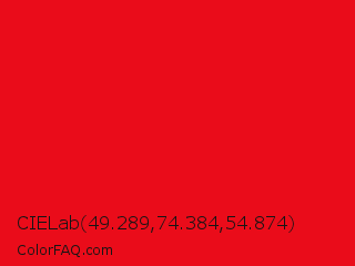 CIELab 49.289,74.384,54.874 Color is a normal red color and the nearest color is Vivid Red #f70d1a. Hex code #ea0c1a and RGB value is rgb(234,12,26). In RGB color space, this color is composed of 92% red, 5% green, 10% blue, In CMYK color space, this color is composed of 0% cyan, 95% magenta, 89% yellow , 8% black , In HSL color space, this color has a hue angle of 356° , 90% saturation and 48% lightness.