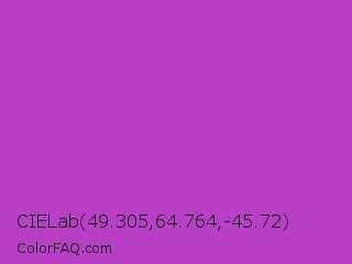 CIELab 49.305,64.764,-45.72 Color is a normal magenta color and the nearest color is Fuchsia Pink #c154c1. Hex code #b840c4 and RGB value is rgb(184,64,196). In RGB color space, this color is composed of 72% red, 25% green, 77% blue, In CMYK color space, this color is composed of 6% cyan, 67% magenta, 0% yellow , 23% black , In HSL color space, this color has a hue angle of 295° , 53% saturation and 51% lightness.