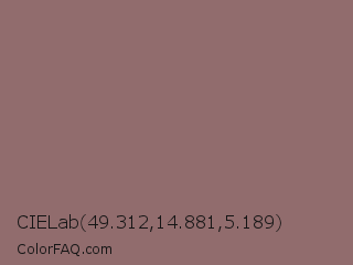CIELab 49.312,14.881,5.189 Color is a normal red color and the nearest color is Opium #8e6f70. Hex code #916c6d and RGB value is rgb(145,108,109). In RGB color space, this color is composed of 57% red, 42% green, 43% blue, In CMYK color space, this color is composed of 0% cyan, 26% magenta, 25% yellow , 43% black , In HSL color space, this color has a hue angle of 358° , 15% saturation and 50% lightness.