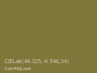 CIELab 49.325,-6.546,34 Color is a normal yellow color and the nearest color is Spanish Bistre #807532. Hex code #7d773a and RGB value is rgb(125,119,58). In RGB color space, this color is composed of 49% red, 47% green, 23% blue, In CMYK color space, this color is composed of 0% cyan, 5% magenta, 54% yellow , 51% black , In HSL color space, this color has a hue angle of 55° , 37% saturation and 36% lightness.